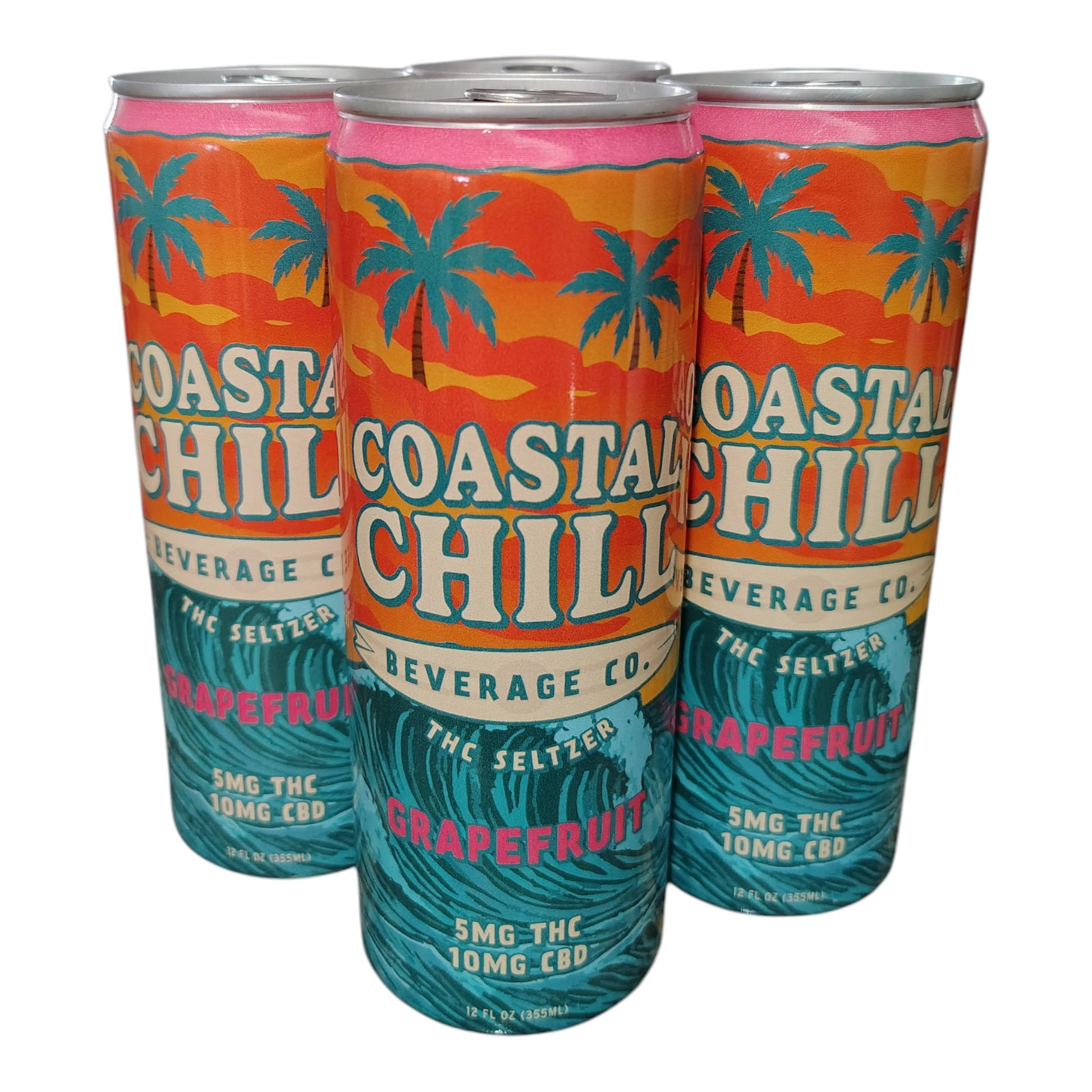 Find your chill with this 4 pack of Grapefruit Coastal Chill THC Seltzer! Each can has 5mg THC and 10mg CBD. 100% natural ingredients with no artificial flavors, colors, or preservatives. Gluten free, vegan, alcohol free, non-gmo. 70 calories.