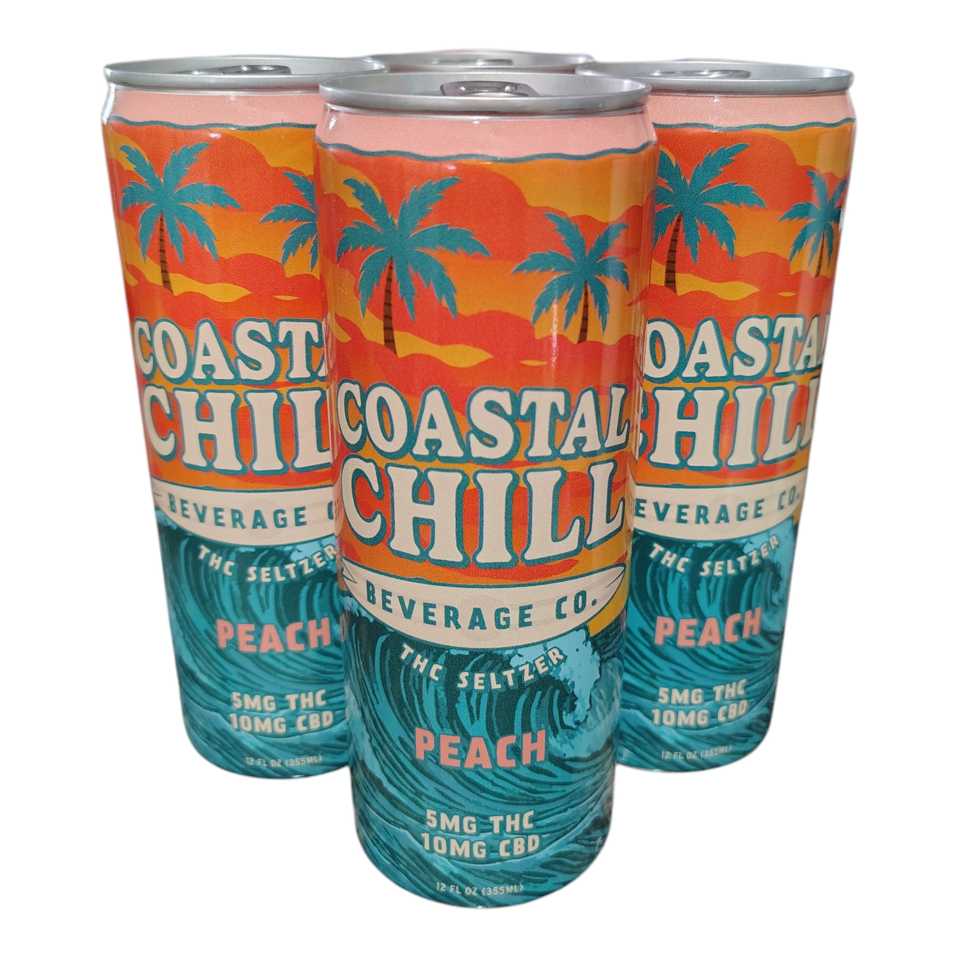 Find your chill with this 4 pack of Peach Coastal Chill THC Seltzer! Each can has 5mg THC and 10mg CBD. 100% natural ingredients with no artificial flavors, colors, or preservatives. Gluten free, vegan, alcohol free, non-gmo. 70 calories.