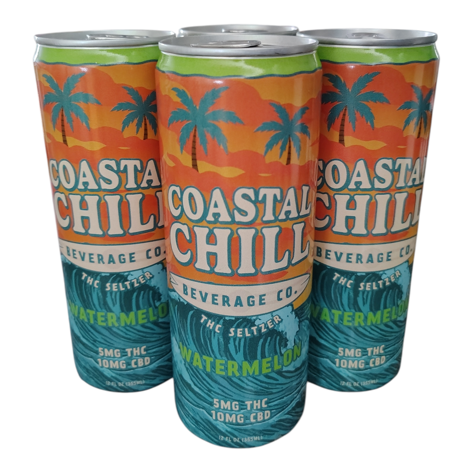 Find your chill with this 4 pack of Watermelon Coastal Chill THC Seltzer! Each can has 5mg THC and 10mg CBD. 100% natural ingredients with no artificial flavors, colors, or preservatives. Gluten free, vegan, alcohol free, non-gmo. 70 calories.